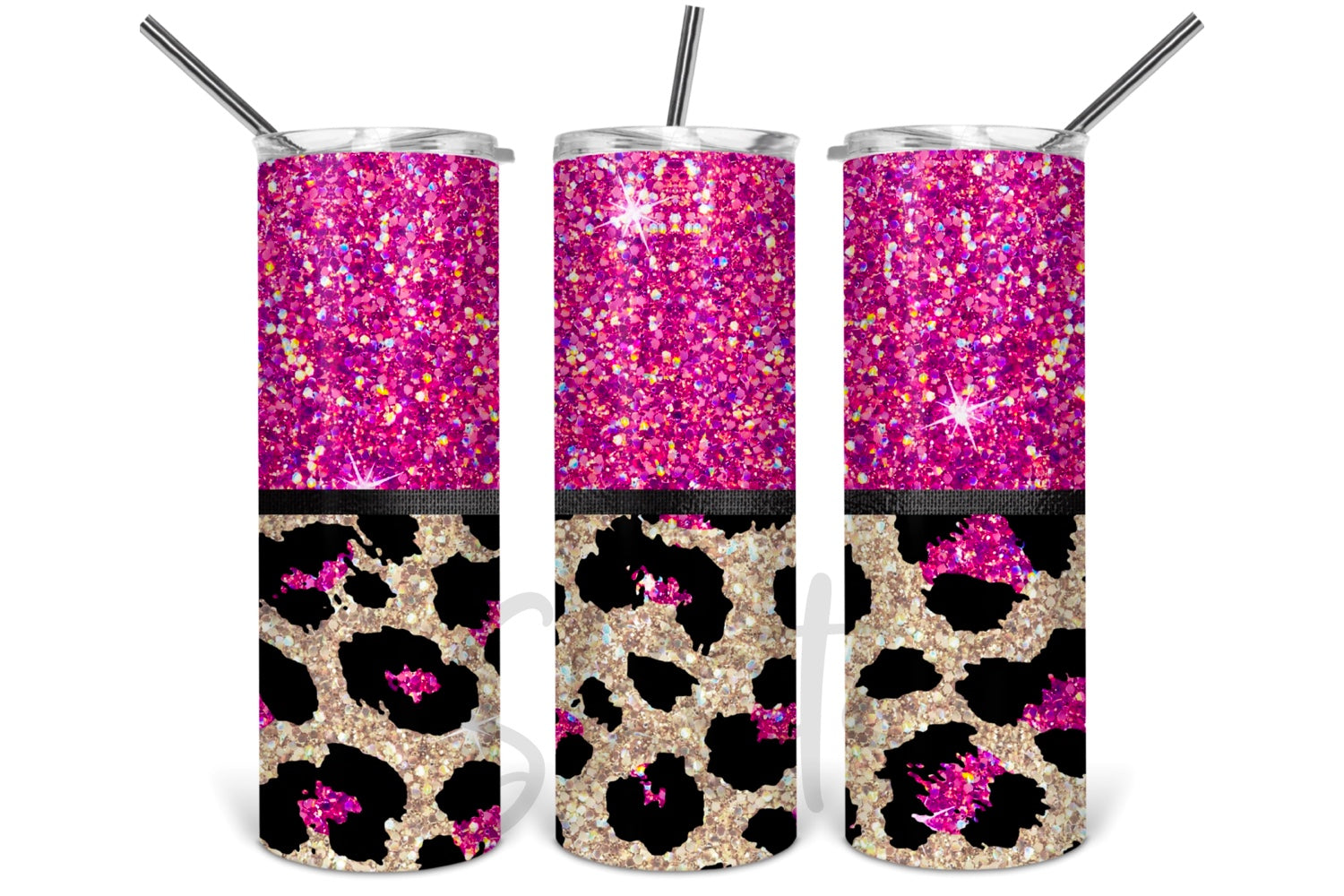 Pink Glitter with Cheetah Bottom - 20 oz or 30oz Skinny Tumblers w/ Lid and Metal Straw
