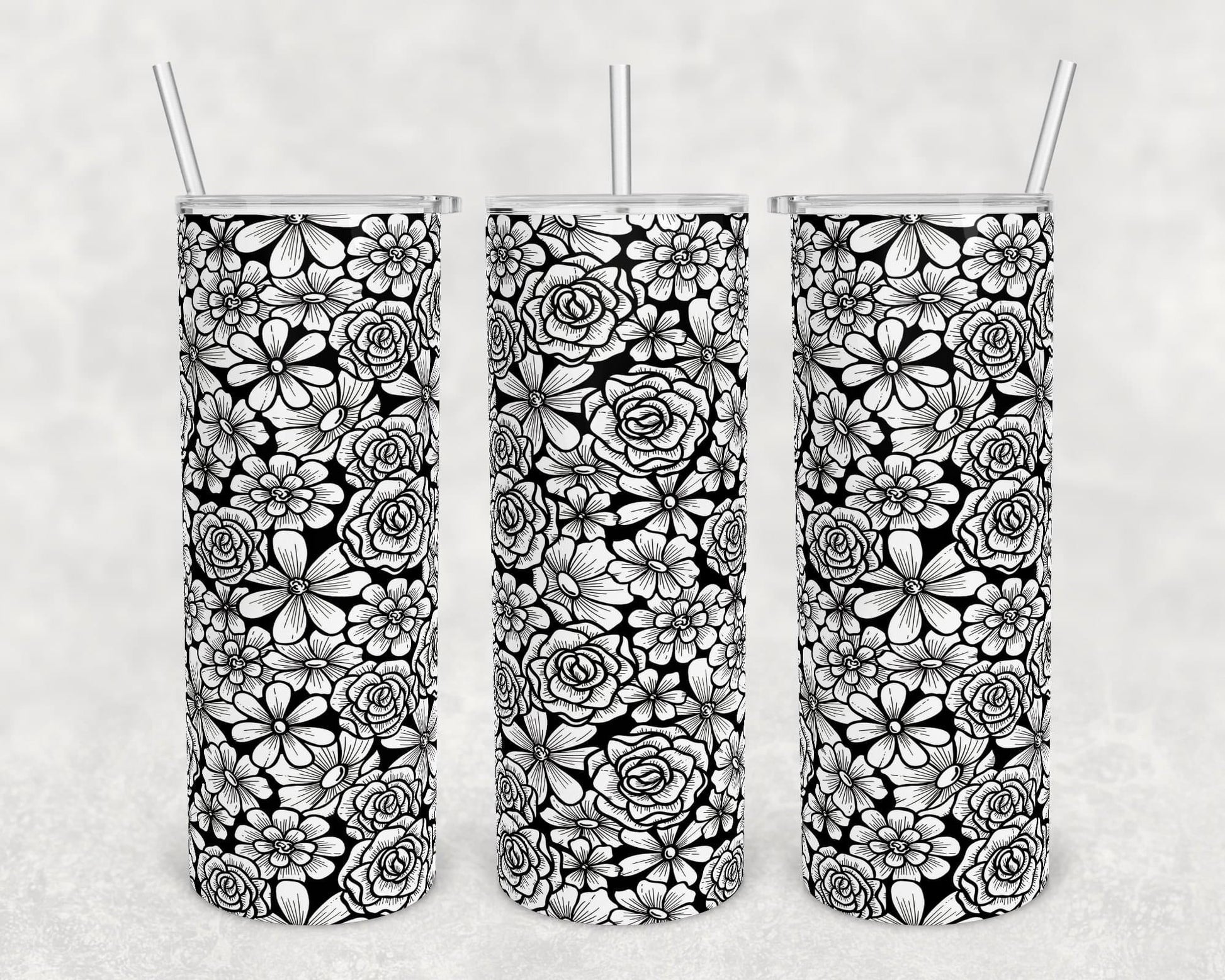 B&W Flowers- 20 oz or 30oz Skinny Tumblers w/ Lid and Metal Straw