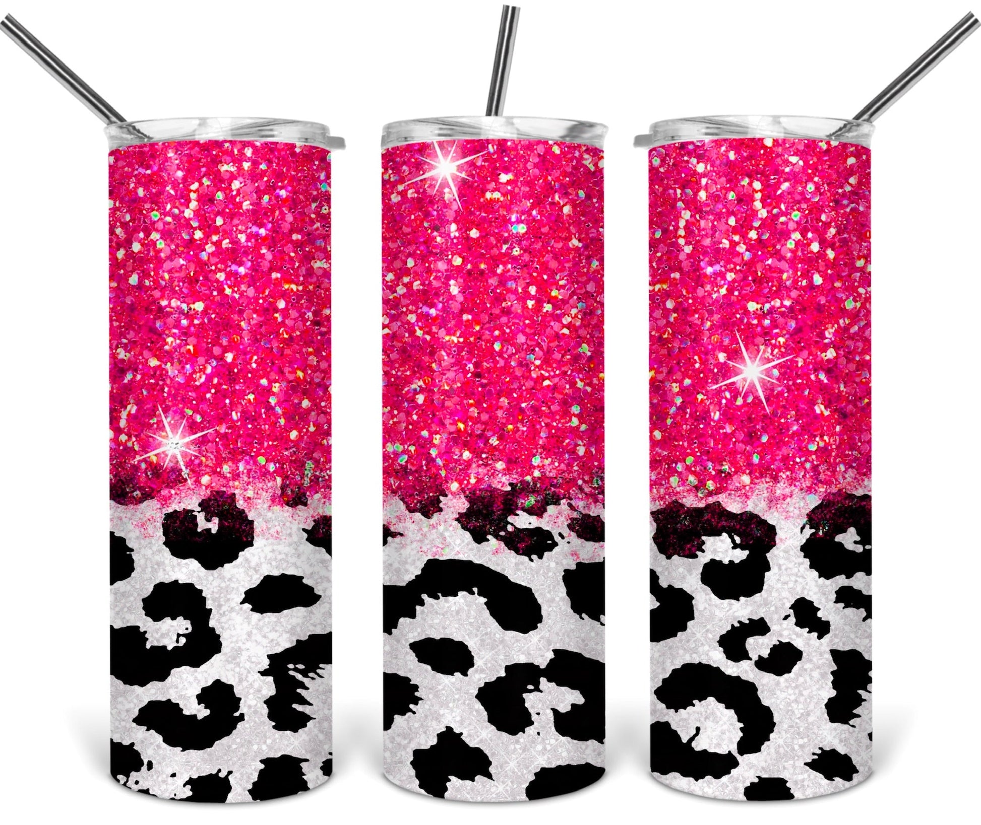 Pink and White Glitter Leopard Sparkles Glitter - 20oz or 30oz Skinny Tumblers w/ Lid and Metal Straw