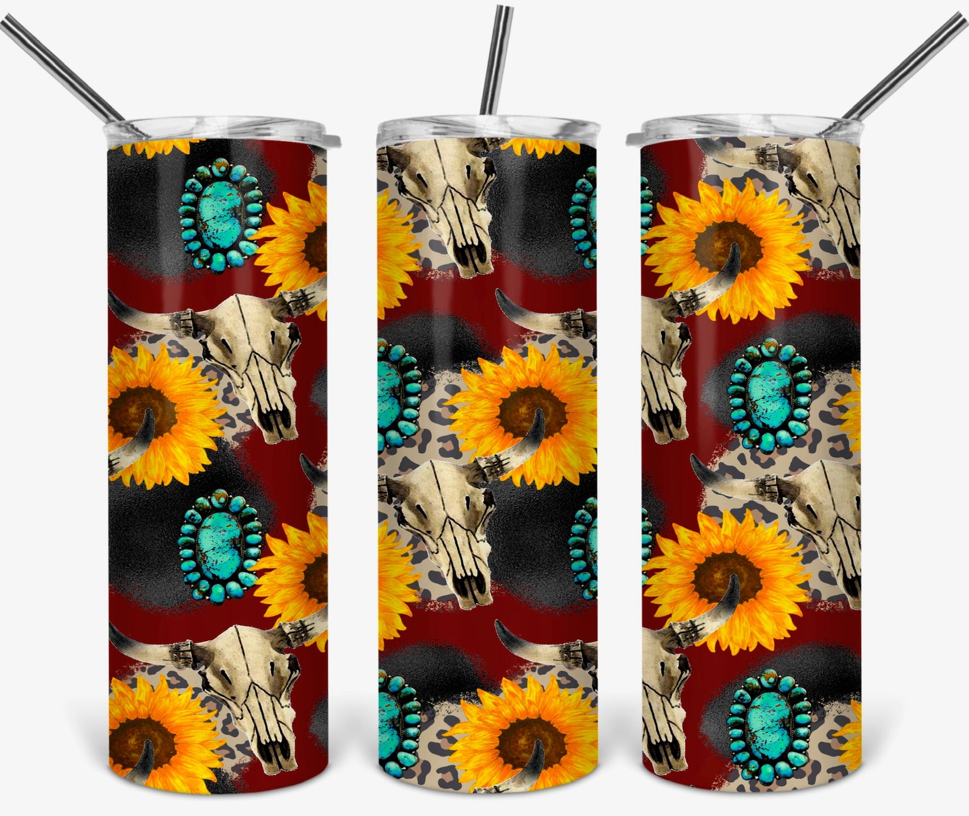 Sunflowers, Skulls and Teal -20oz or 30oz as Skinny Tumblers w/ Lid and Metal Straw
