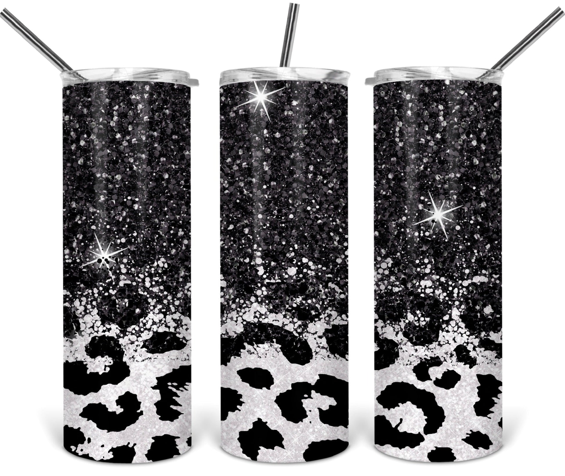 Black and white Glitter Leopard Sparkles Glitter - 20oz or 30oz Skinny Tumblers w/ Lid and Metal Straw
