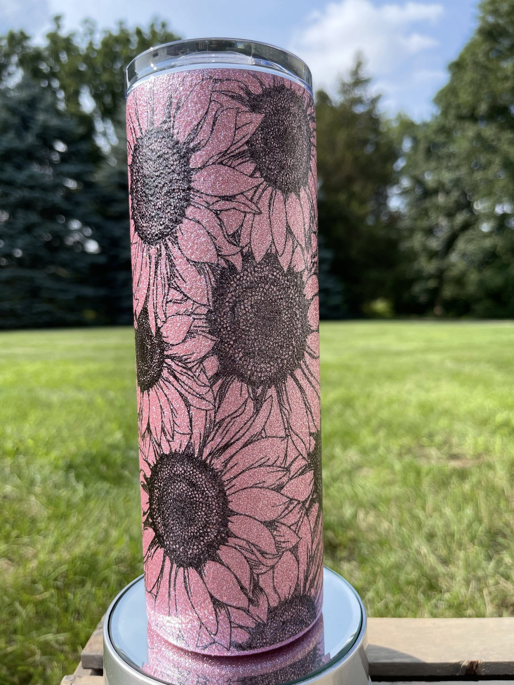 Pink Glitter Sunflower - 20oz Skinny Tumblers w/ Lid and Metal Straw