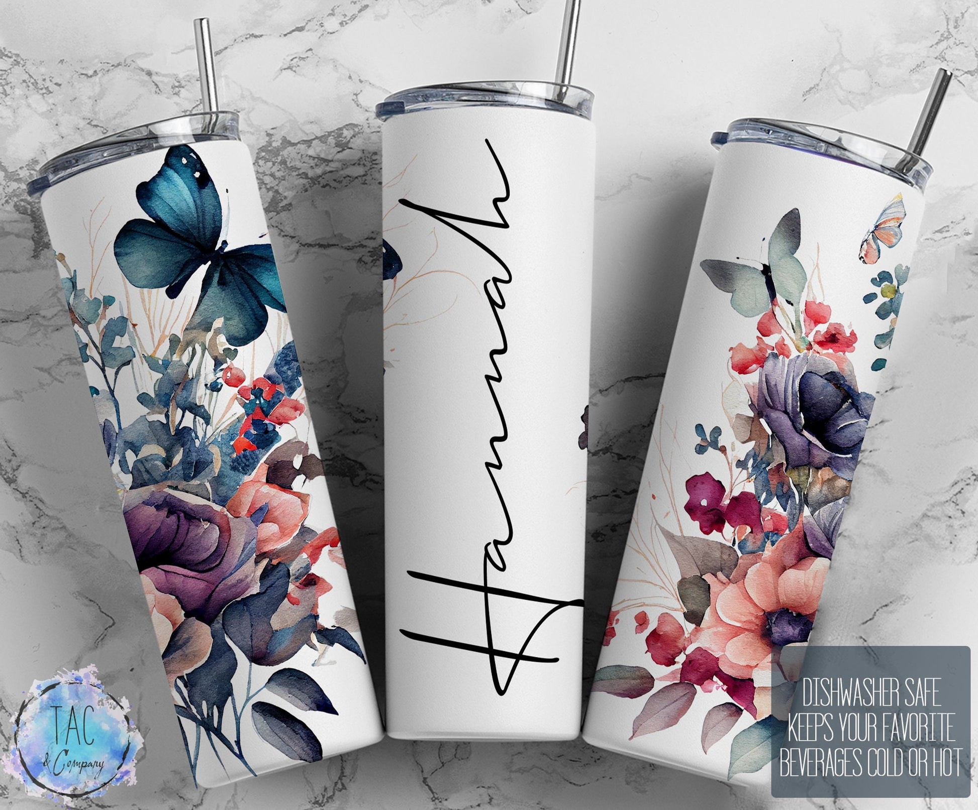 Floral Butterfly Tumbler Wrap Add Your Own Name Purple Flowers, Seamless Gift for her, Travel Tumbler- Skinny 20oz Tumbler