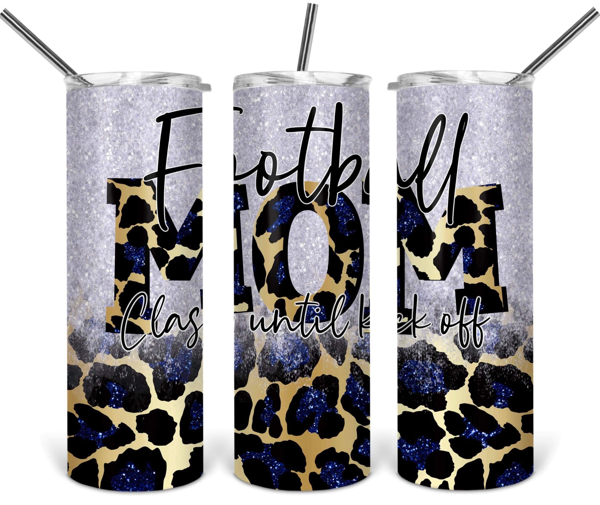 Football Mom Leopard Blue and Silver Glitter School - 20 oz or 30oz Skinny Tumblers w/ Lid and Metal Straw