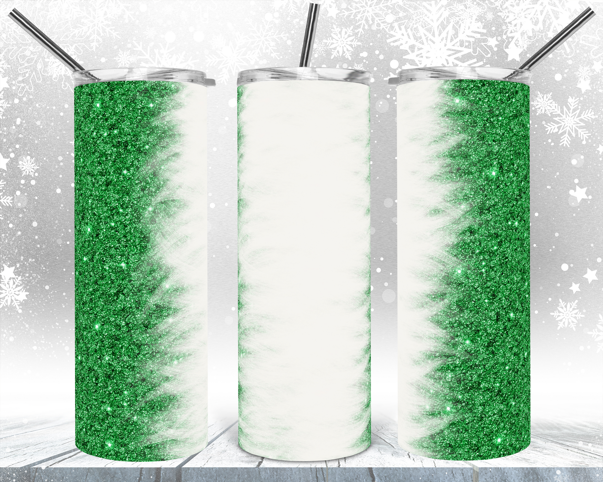 Green Glitter Feather White - 20oz or 30oz Skinny Tumblers w/ Lid and Metal Straw