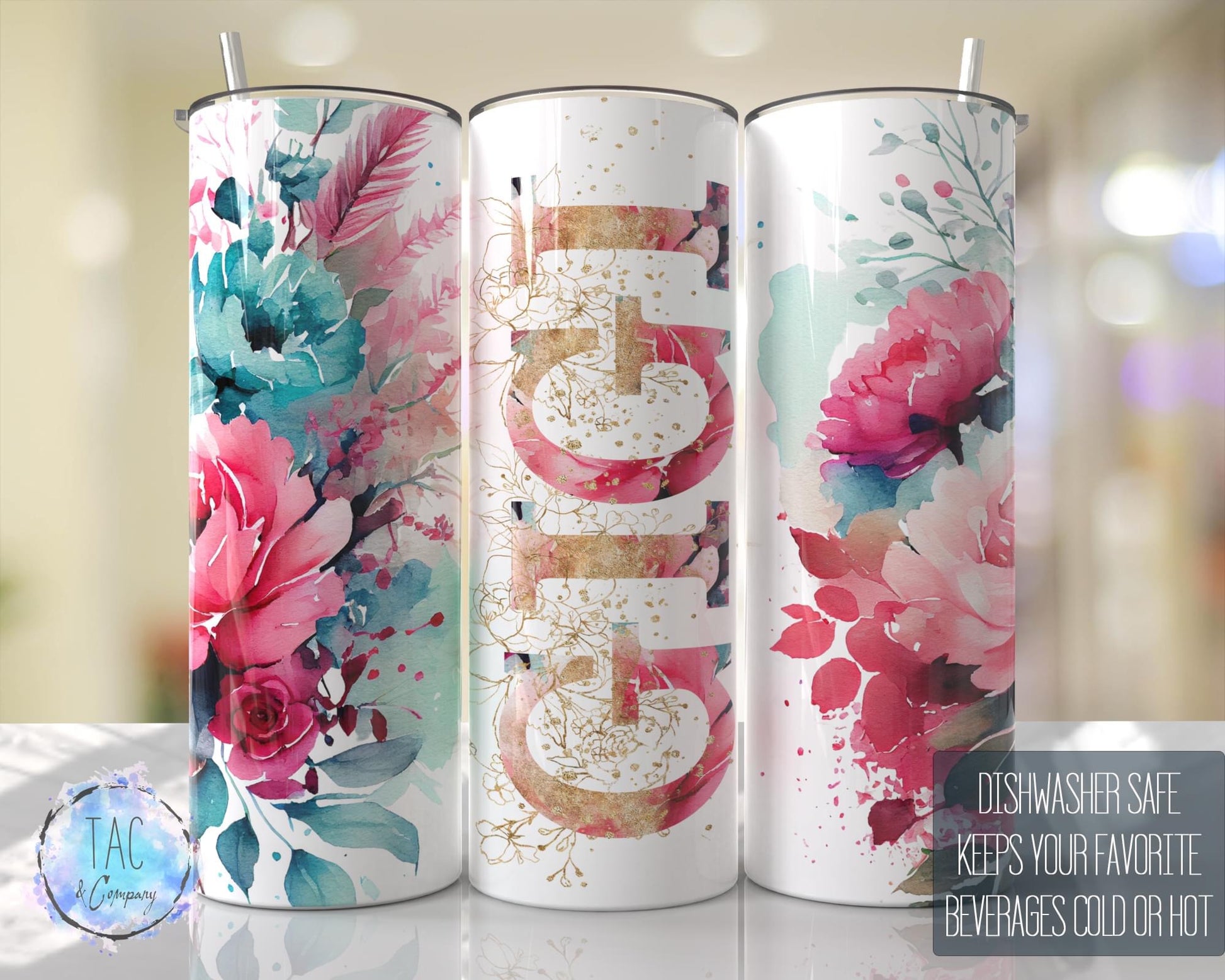 Gigi Hot Pink Floral Full Wrap -20oz or 30oz Skinny Tumblers w/ Lid and Metal Straw