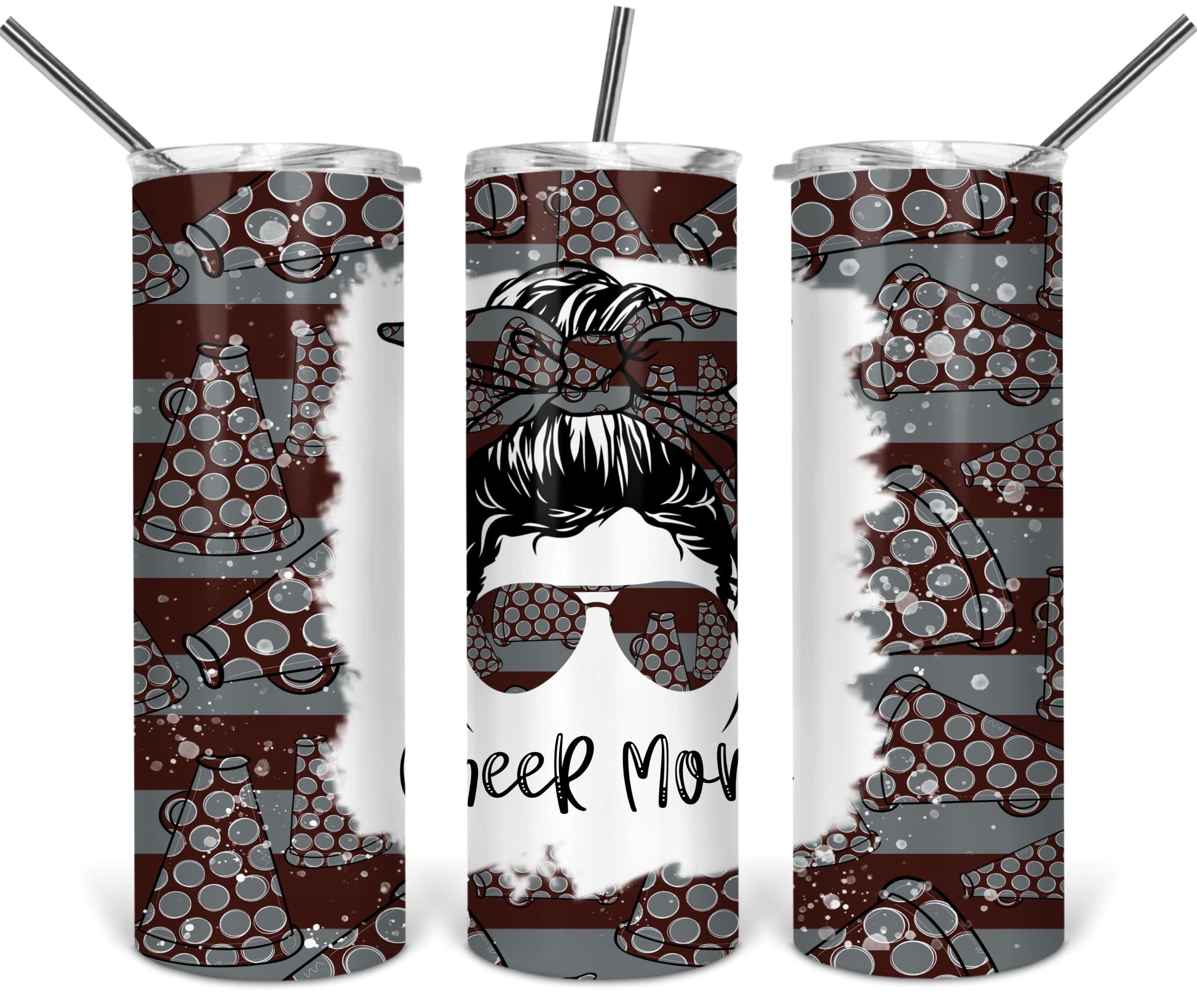Messy Bun Cheer Mom School - 20 oz or 30oz Skinny Tumblers w/ Lid and Metal Straw