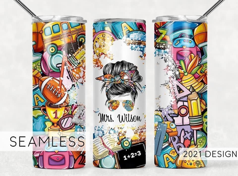 Teacher w/ Name Mash- 20oz or 30oz Skinny Tumblers w/ Lid and Metal Straw