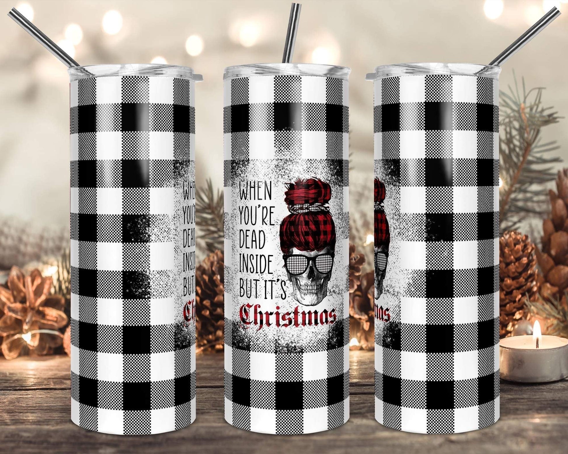 White Plaid Dead Inside - 20 oz or 30oz Skinny Tumblers w/ Lid and Metal Straw