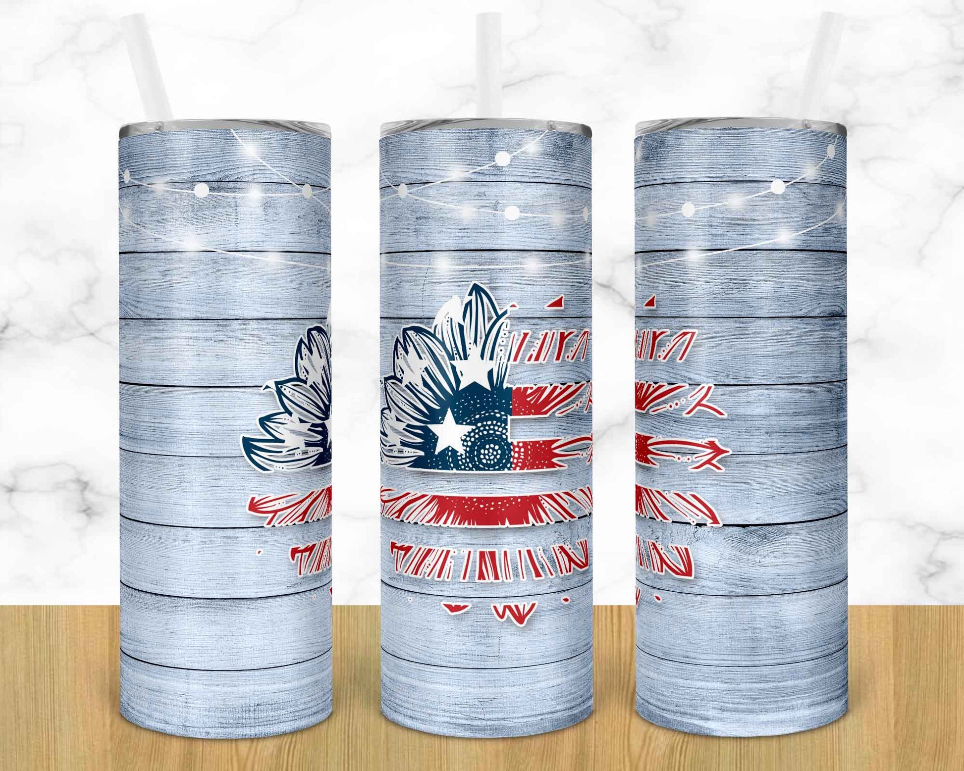 Wooden Red White & Blue Sunflower- 20 oz or 30oz Skinny Tumblers w/ Lid and Metal Straw